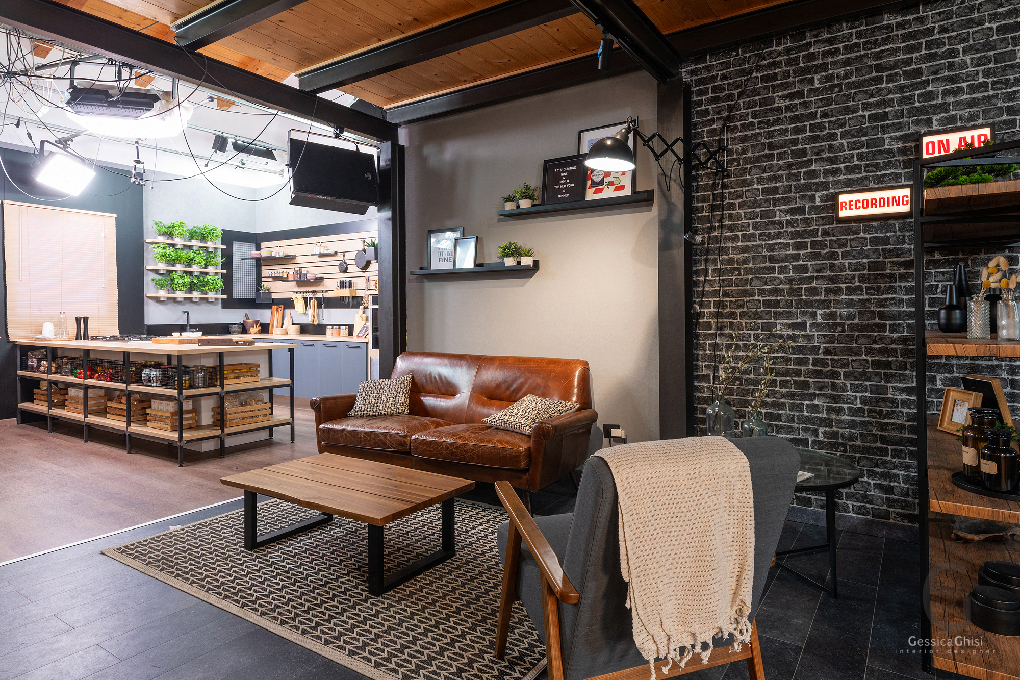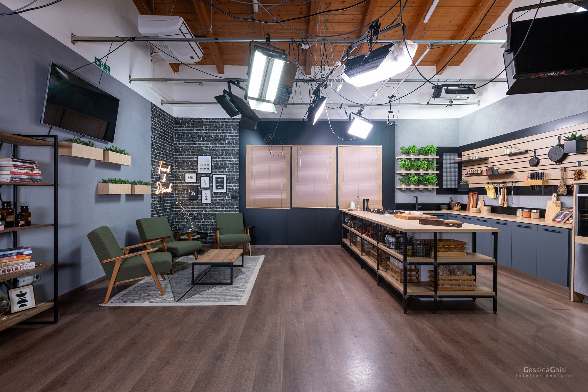 Oltre al terzo restyling della cucina che vedete in TV, è nata un’altra cucina, anche per lei nulla di scontato, interamente customizzata. Lo studio ha diversi scenari, con un unico punto in comune: la condivisione. Dai tavoli alti con sgabelli, al tavolo basso con le panche, ai due angoli con divani e poltrone.