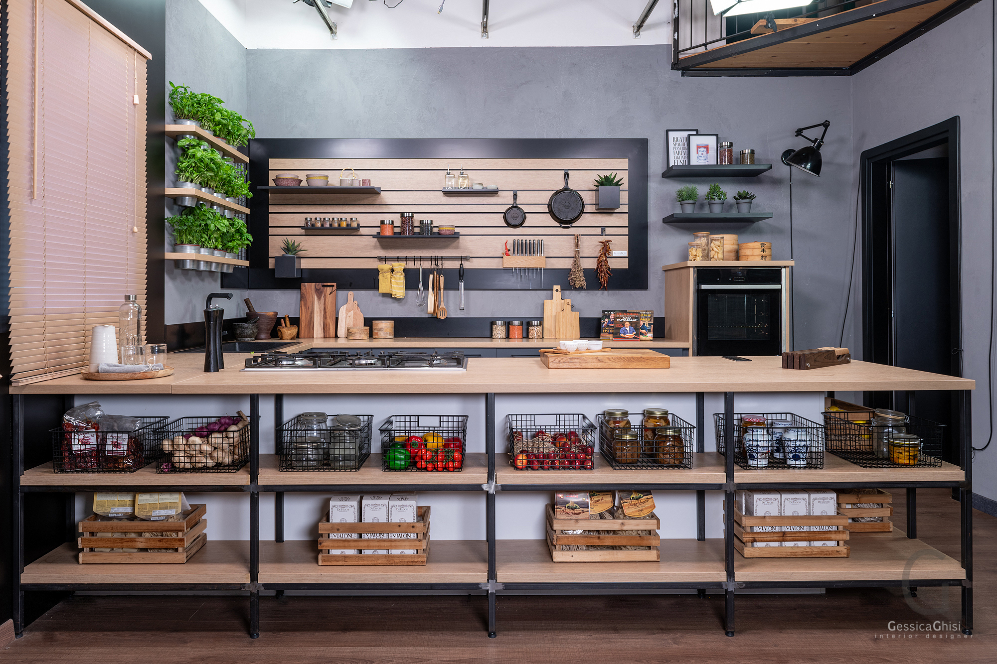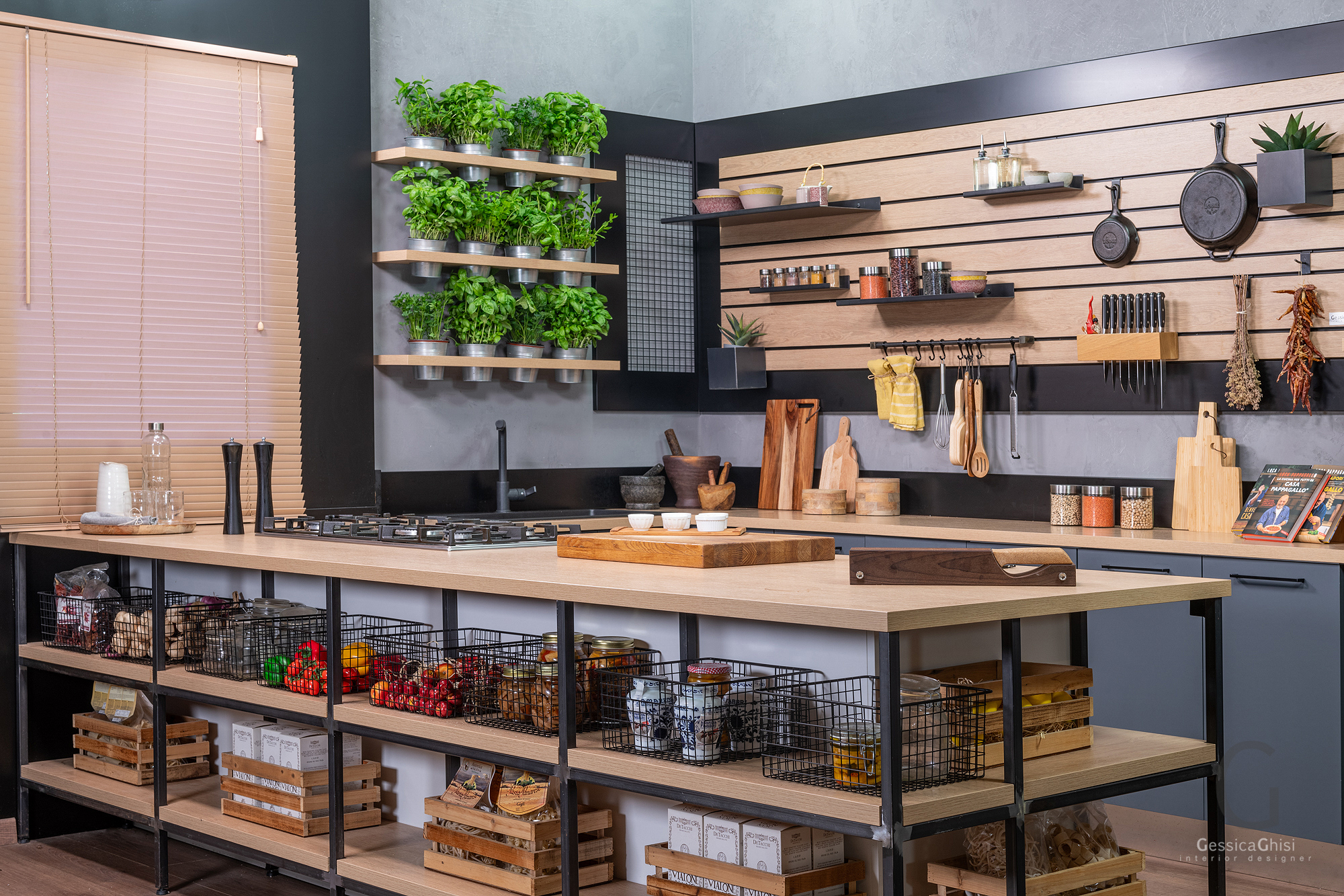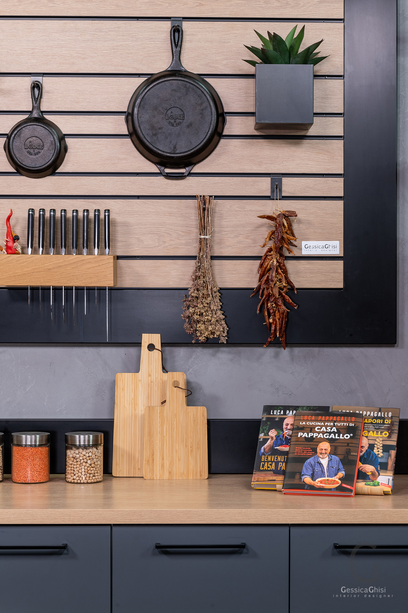 Questa avventura è partita nel 2020 con la “nascita” della cucina che si vede in TV. Ho voluto creare una cucina riconoscibile, cucita addosso a lui. Luca non è il classico chef, ha un approccio curioso e creativo alla cucina, ha personalità e carattere, non si adatta al pubblico per piacere, ma piace per quello che è… La sua cucina non poteva essere la solita con basi e pensili, doveva essere personalizzabile e doveva poter evolversi nel tempo. Il pannello della schiena con i canali per agganciare/spostare le mensole può essere modificato e personalizzato, contenendo tutto quello che serve in cucina.